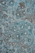 The Moonrock wallpaper features a detailed monochrome design that evokes the pits and crevices found on the lunar surface. The hand-drawn elements are set against a textured background, creating an intense and mysterious pattern. The image is printed onto a cork substrate that adds texture to the wallpaper, enhancing its otherworldly character.