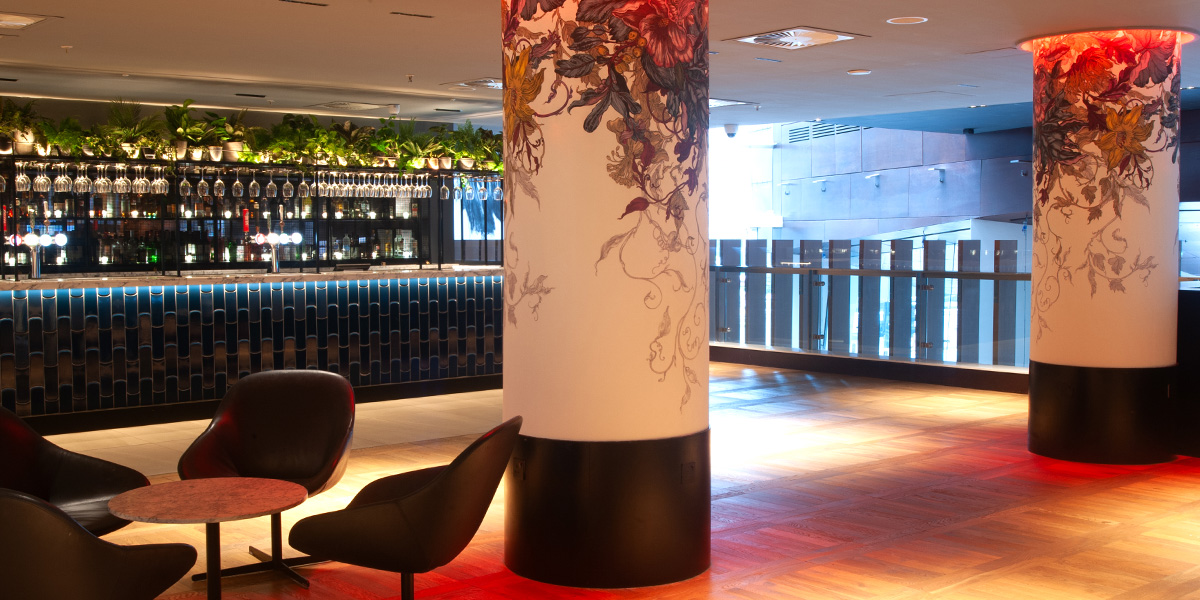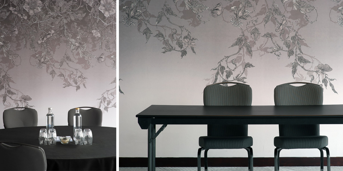 The hotel’s event areas have been completely reimagined, with our custom botanical designs printed on high-performance Type II vinyl forming a central part of the interior concept. Tendrils flow gracefully across the walls, while bold, large-scale florals wrap around pillars to create a sense of continuity and visual harmony. Each piece was carefully designed to complement the hotel’s contemporary architecture, bringing organic forms and soft natural tones into balance with sleek structural lines.