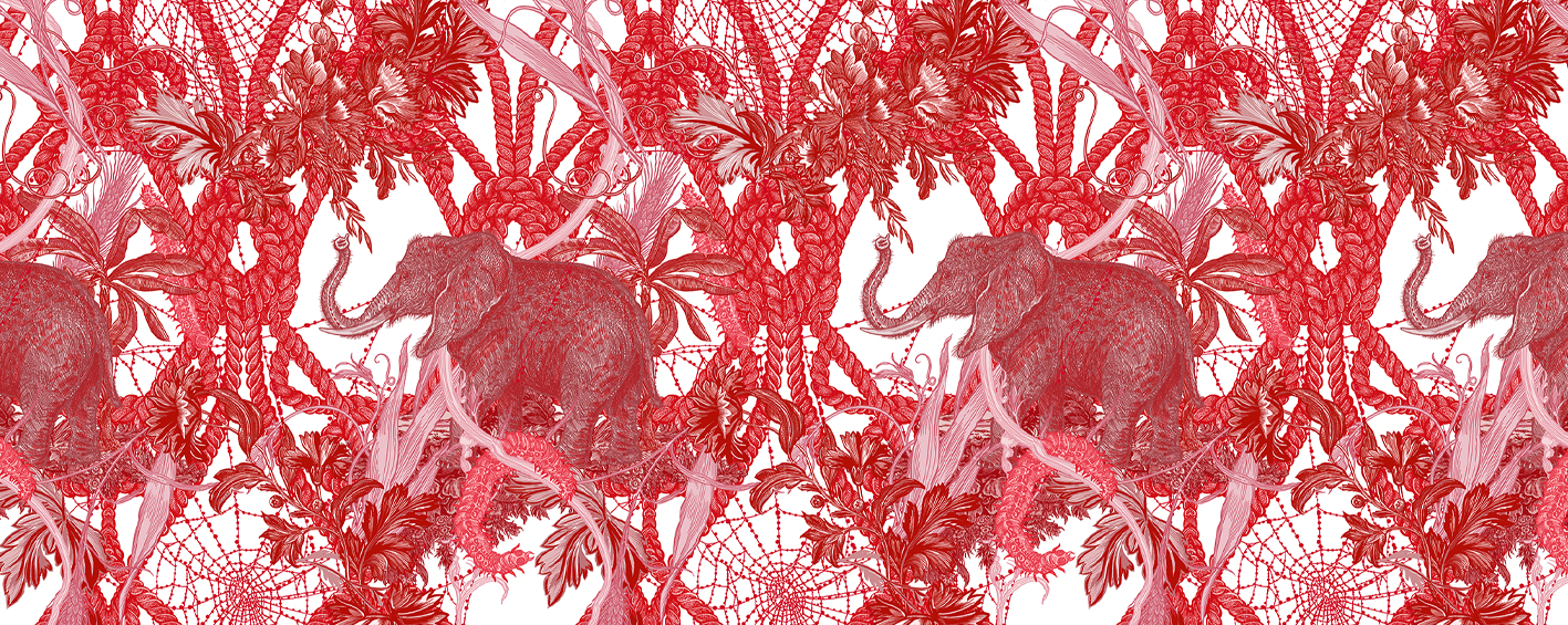 Digitally printed on matt paper, the pattern brings together silkworms, threads and delicate webs, la toile in French, interlaced with ropes that wind through exotic plants and subtle references to historic trade routes. At the heart of the composition sits the elephant, a commanding yet contemplative presence. Long associated with memory, strength and wisdom, the elephant becomes a symbolic guardian of textile history, a keeper of stories, skills and cultural knowledge carried across continents and generations.