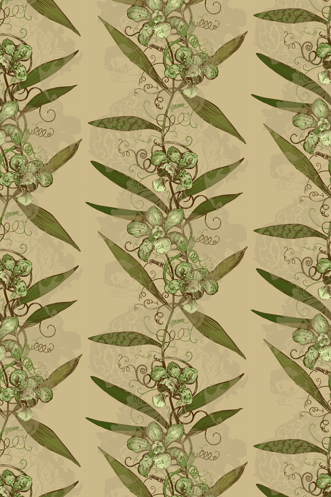 Oriental Orchid is an elegant floral pattern with a subversive modern twist. Layered over the intricately hand-drawn orchids are images from a Manga cartoon that nod to the flower’s sexual properties. The techniques used to produce the subtle overlays of matt and gloss inks demonstrate the unique qualities that can be achieved through hand printing.